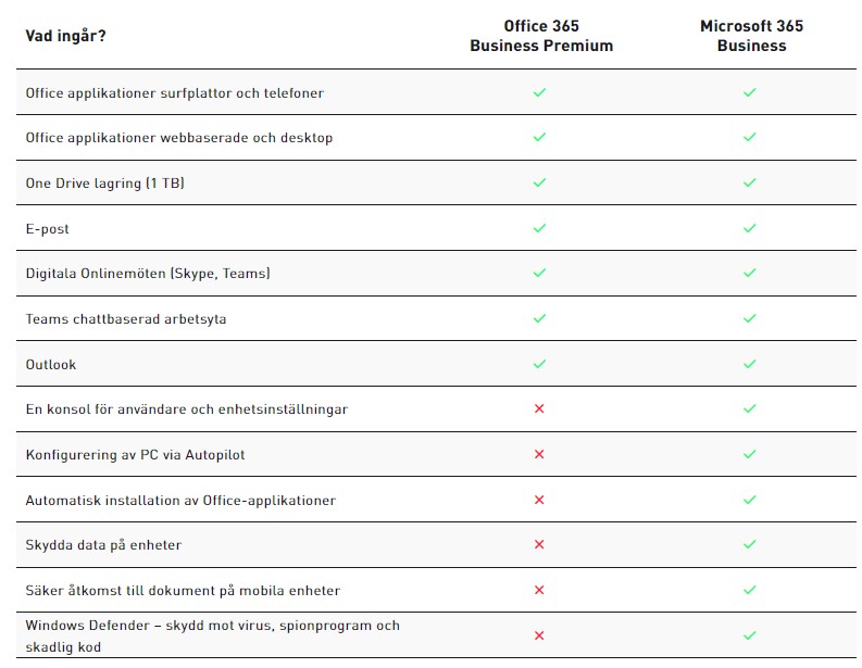 Några saker som kan vara till hjälp på vägen är om du till exempel är i behov av att uppgradera ditt operativsystem till Windows 10. Hur många olika enheter har du på ditt företag? Är du orolig för datasäkerheten? Följer du GDPR? Då kan de produkter och tjänster som följer med Microsoft 365 vara ett mer kostnadseffektivt alternativ för dig. Nedan tabell ger en enkel bild av skillnaden och gör det lätt att jämföra.